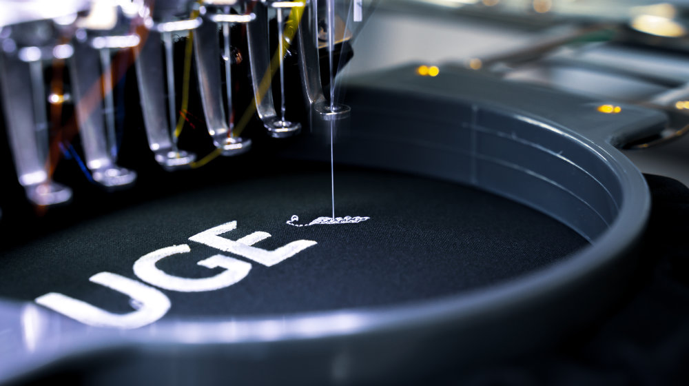 Hier wird das Motiv nicht gedruckt, sondern mit Nadel und Faden digital auf den Stoff aufgebracht.